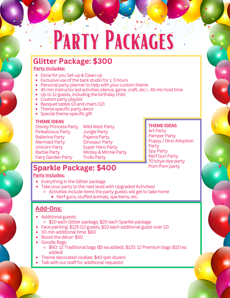 Let’s get your party set up! Begin by choosing your theme, party package, and add-ons. Once a party date and time is set, we will match you with one of our instructors. If you have a request for the teacher, please inform us. Thank you for having your party with us!